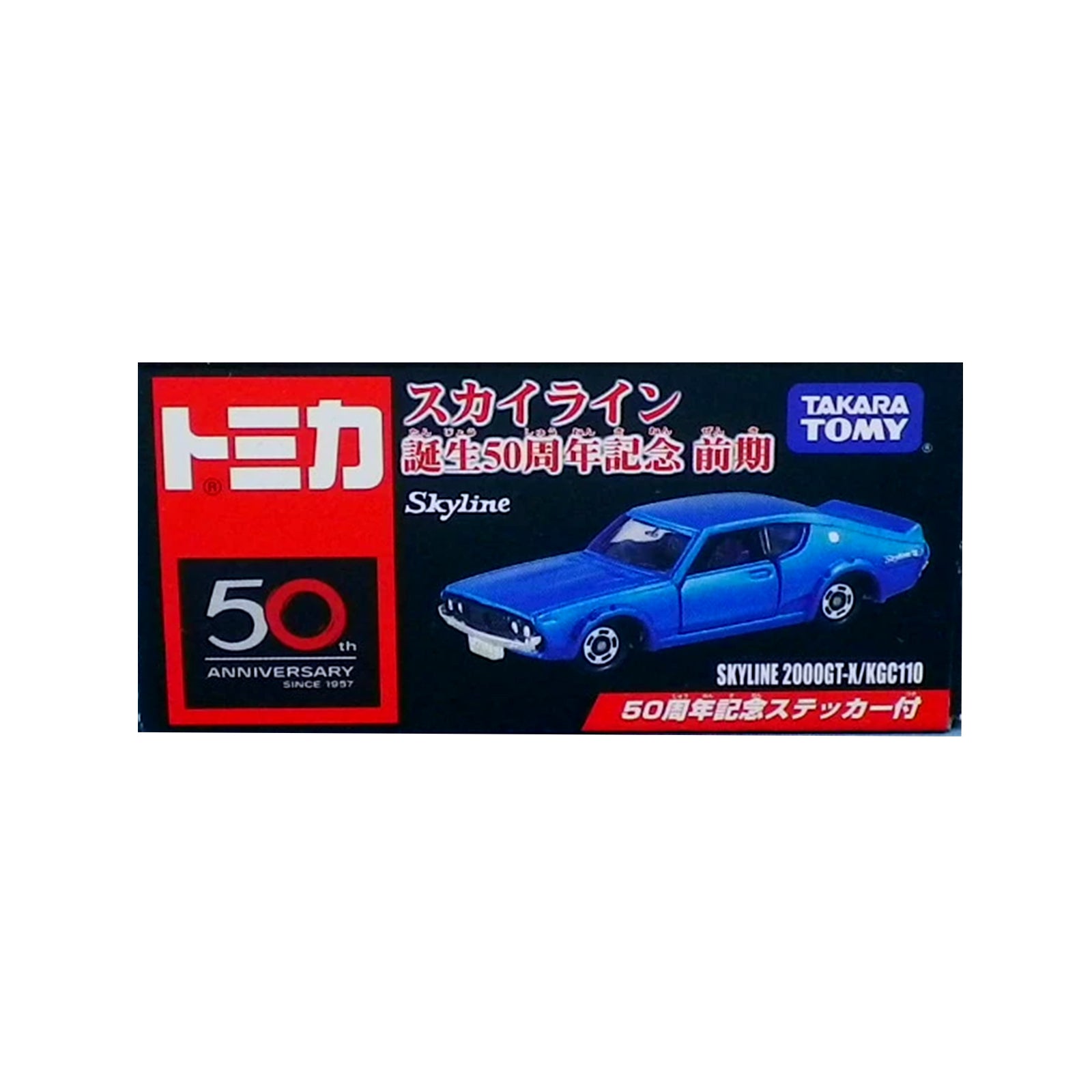 The toy includes the main figure of the Skyline 2000GT-X/KGC110, as well as a sticker featuring the 50th anniversary logo and car's name.